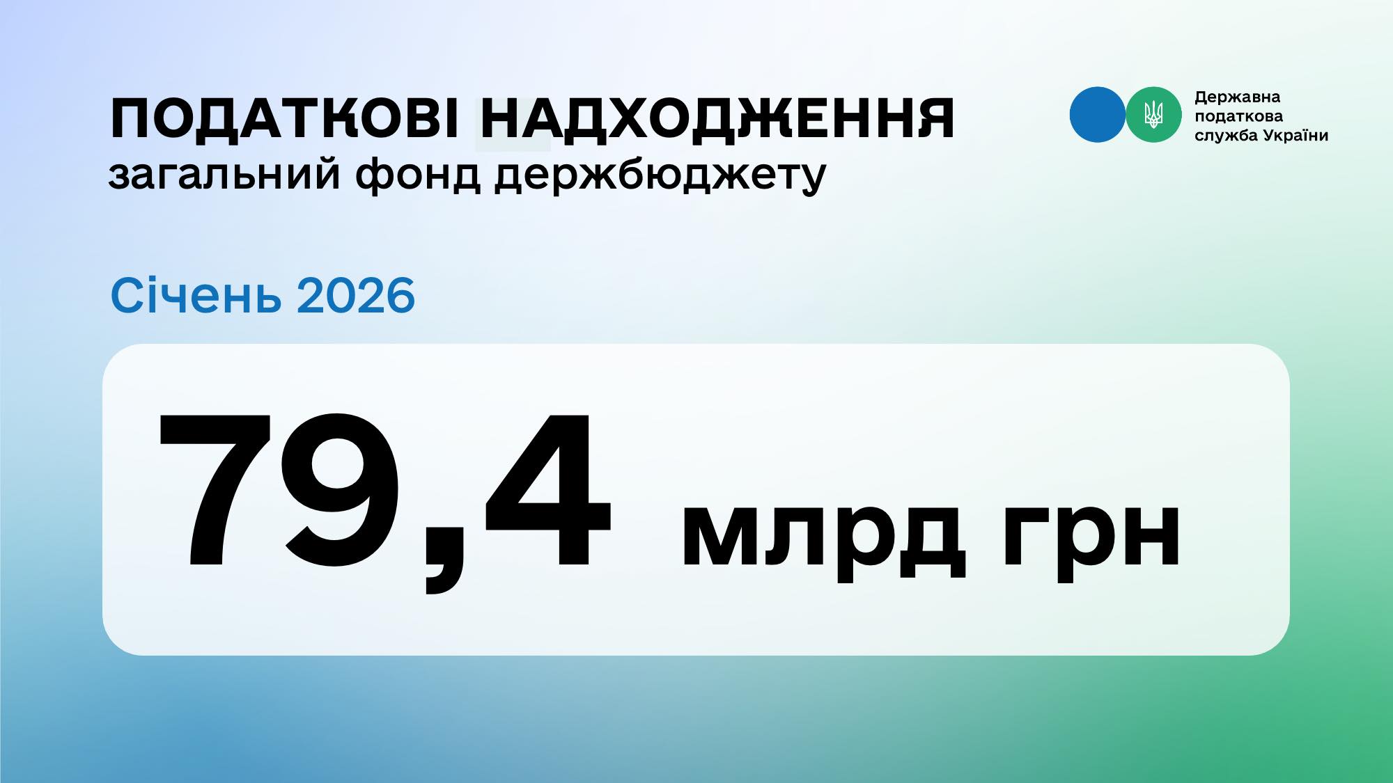 До загального фонду держбюджету у січні 2026 року  надійшло 79,4 млрд грн (91,8 % плану) податків та зборів, які контролює ДПС. Про це на своїй сторінці у Facebook повідомила в. о. Голови ДПС Леся Карнаух